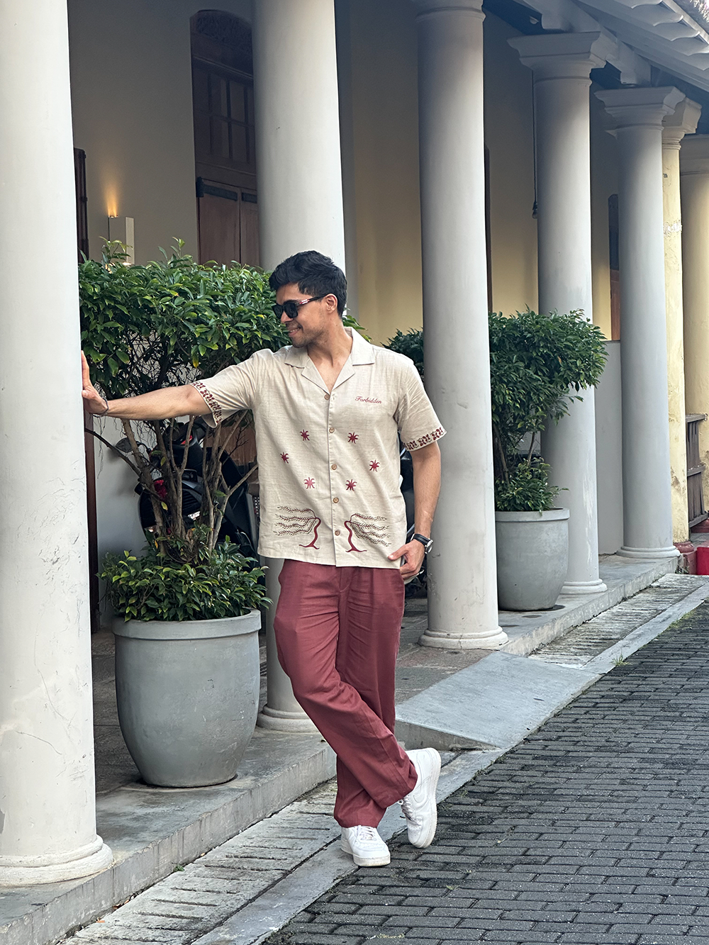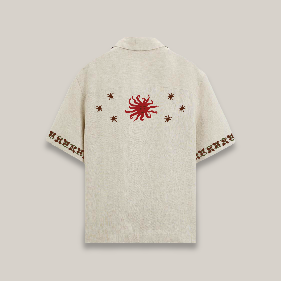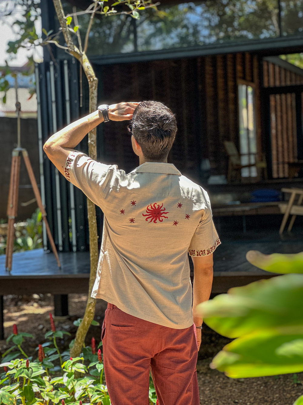 Masandro Linen Shirt bows to the sacred bond between sun and soil. With flowing prints and rooted forms, this shirt honours the trees that hold the world still and the sun that keeps it alive.