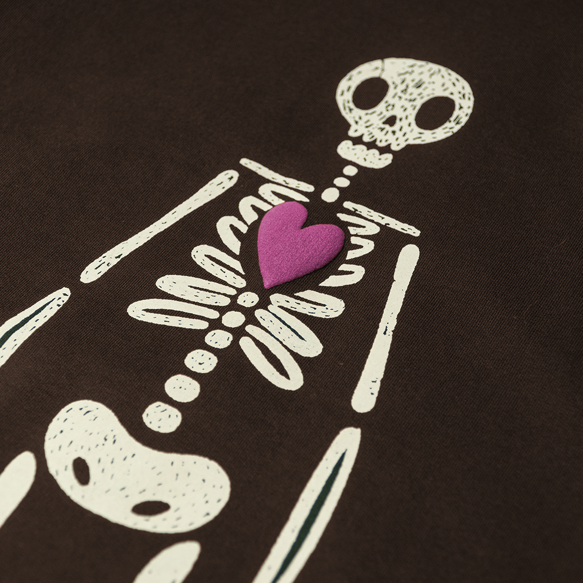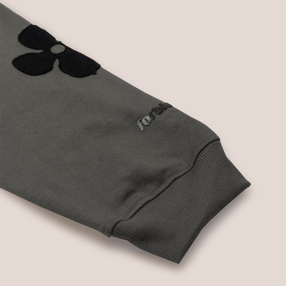 The design is a screen print in puffed effect on the petals and leaves. The centre of the flower is a special rubberised effect completely finished by hand. Each print has a different texture, so every unit is unique. The pocket is completed with a cute patch of orange, which completes the lyrics beautifully.